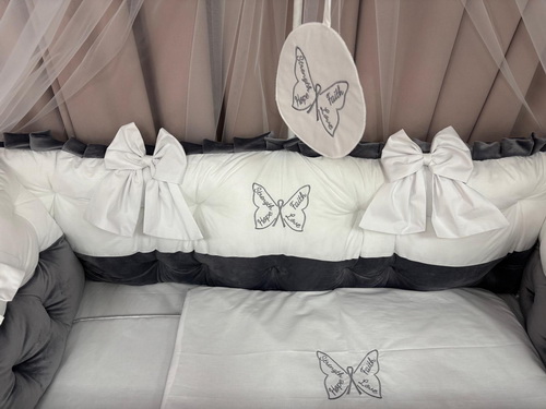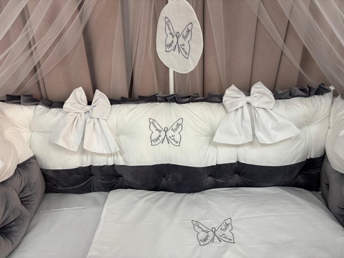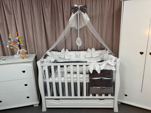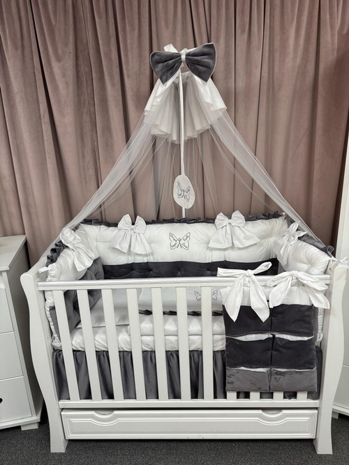 PEPPIbambini ROYAL White Grey Terciopelo 11 Piezas Juego de Ropa de Cama para Cuna, 100% Algodón con bordado + Mosquitera